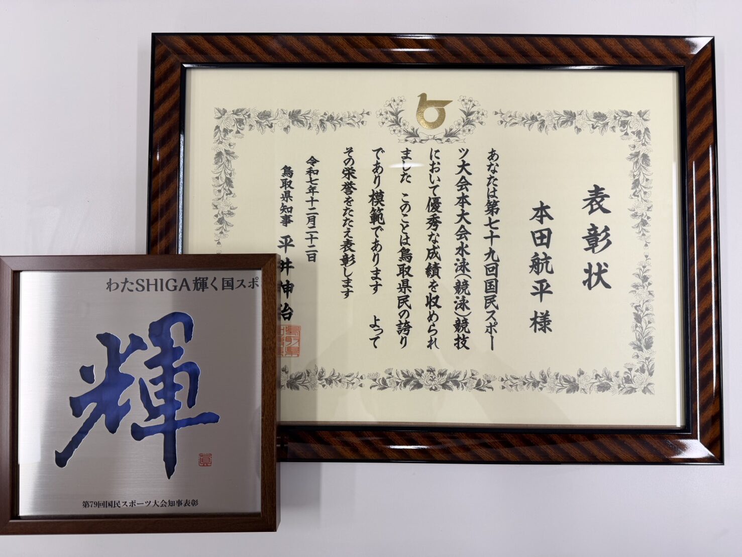 9月に行われた国民スポーツ大会の成績から鳥取県知事より表彰を受けました!